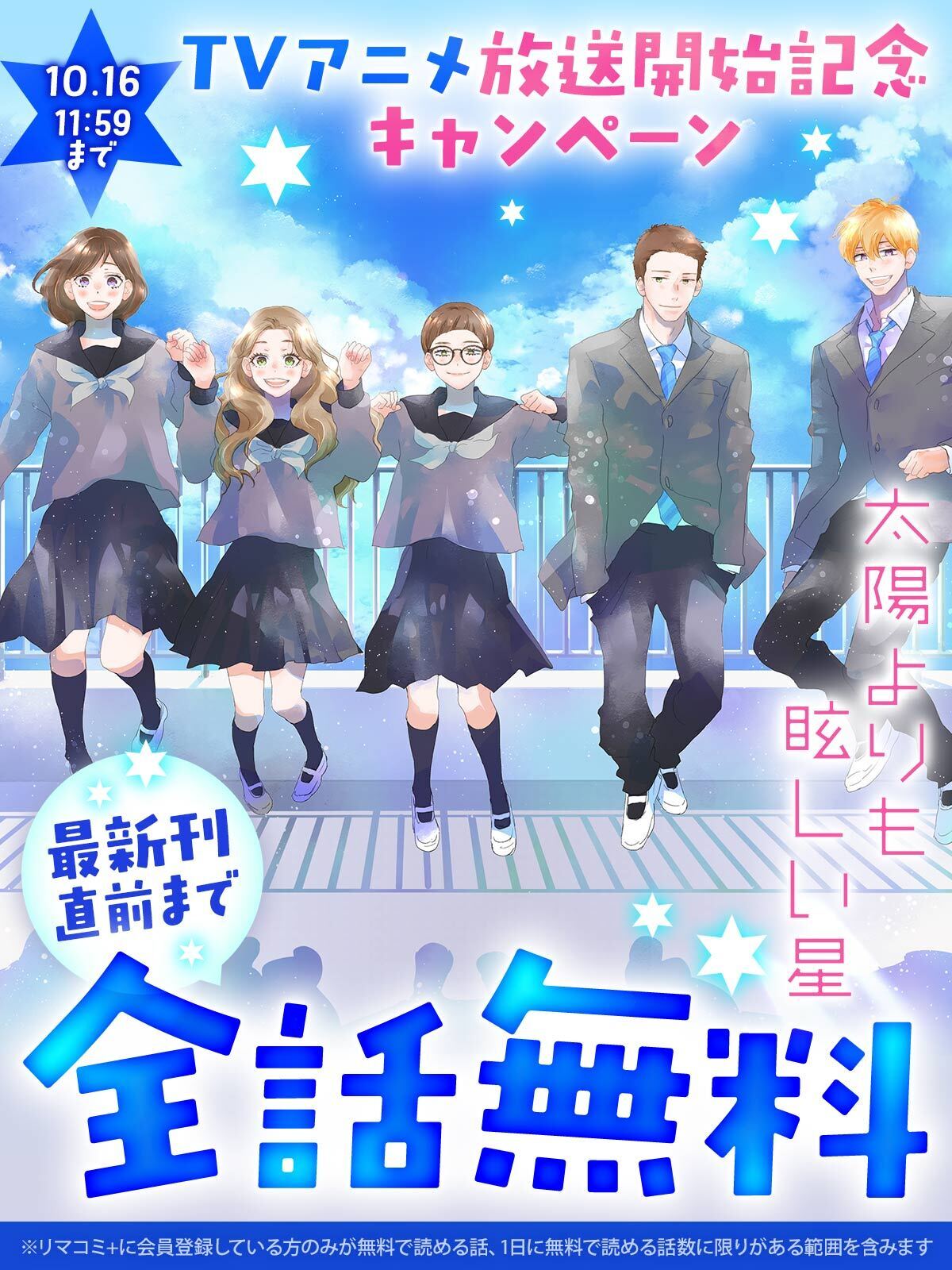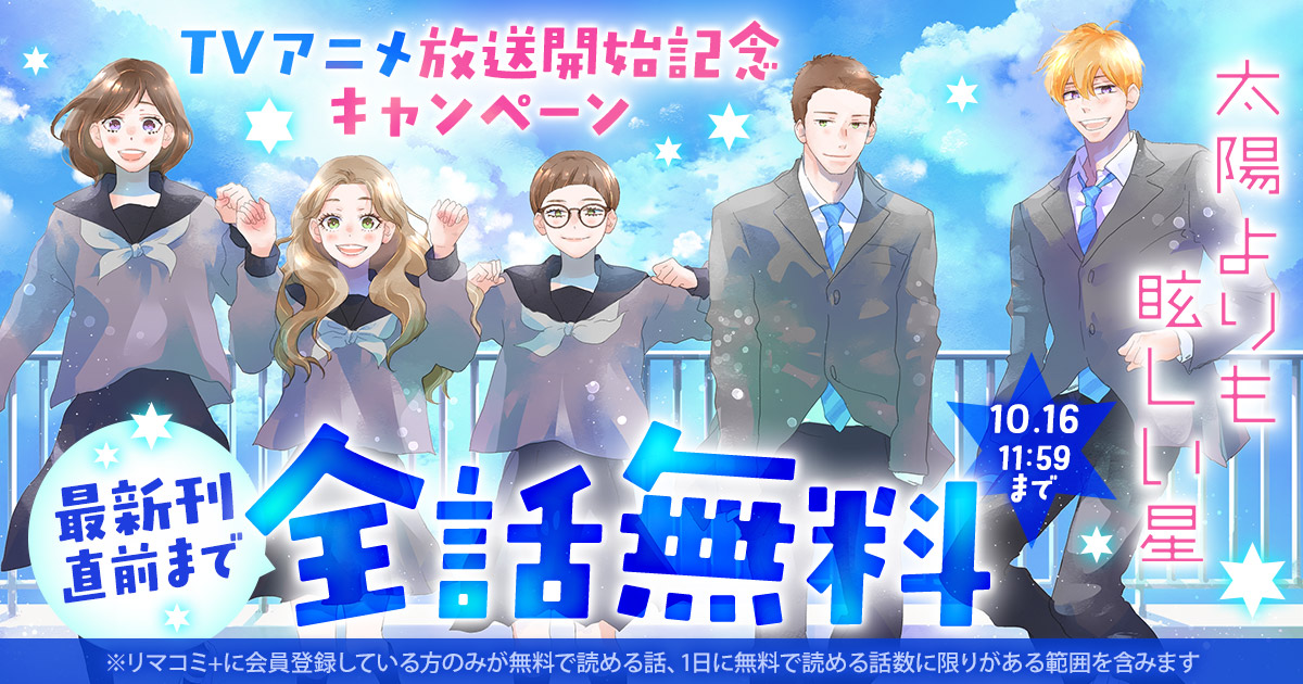 本日10/2より 『太陽よりも眩しい星』 (河原和音)のTVアニメが放送開始することを記念して、原作コミックが 最新刊直前まで全話無料で読める キャンペーンを、集英社の少女・女性向けマンガ作品を集めた総合配信サイト「リマコミ+」にて開催中です。