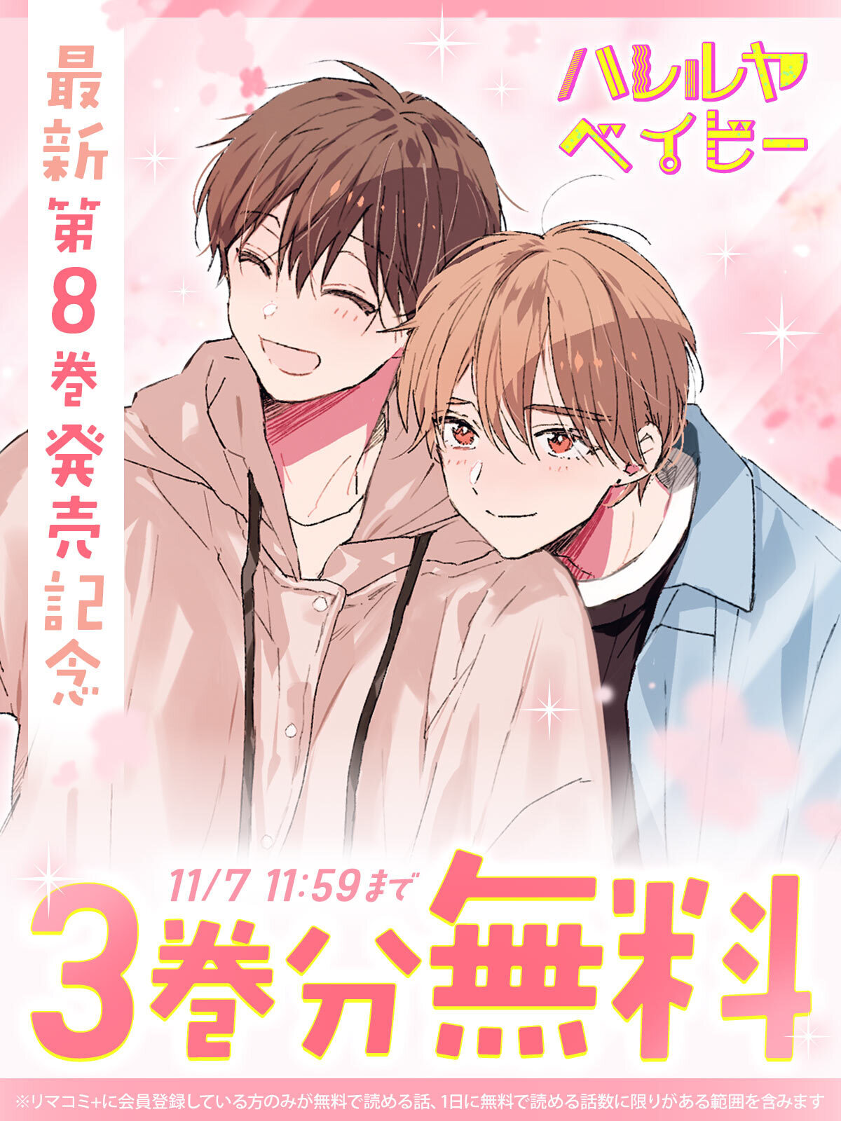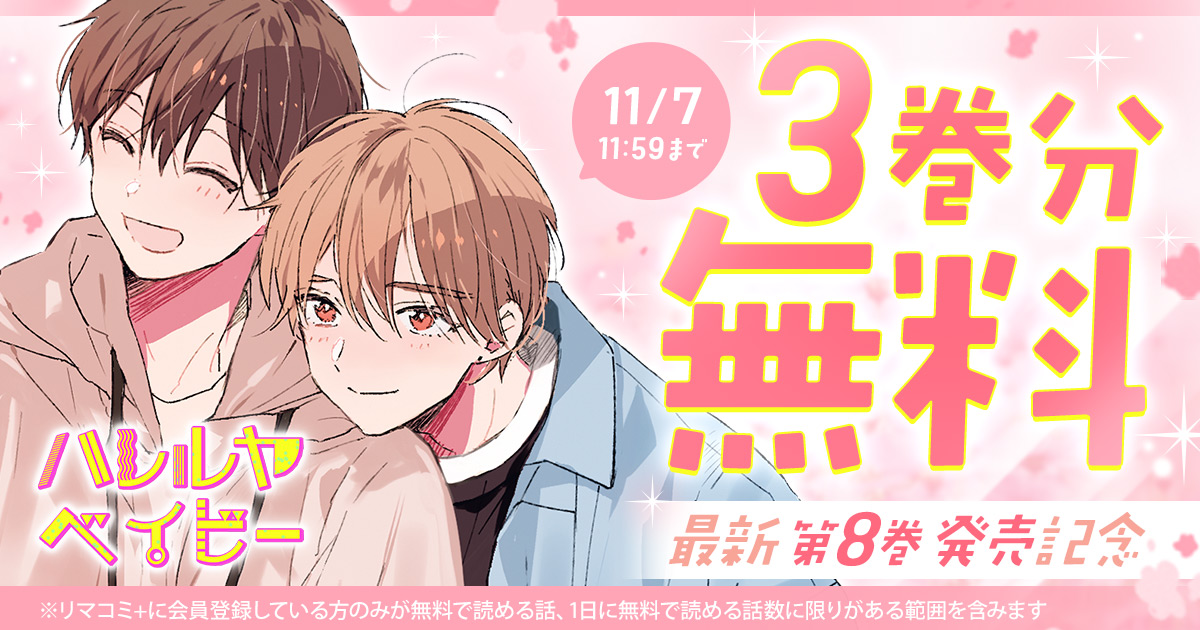 『ハレルヤベイビー』 (仔縞楽々)最新第8巻が本日10/24(金)に発売したことを記念して、 3巻分無料で読める キャンペーンを、集英社の少女・女性向けマンガ作品を集めた総合配信サイト「リマコミ+」にて開催中です。