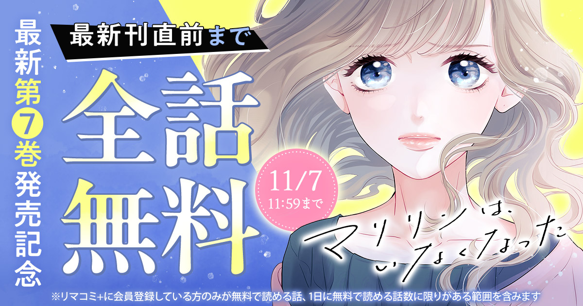 『マリリンは、いなくなった』 (葉月めぐみ)最新第7巻が本日10/24に発売したことを記念して、 最新刊直前まで全話無料で読める キャンペーンを、集英社の少女・女性向けマンガ作品を集めた総合配信サイト「リマコミ+」にて開催中です。