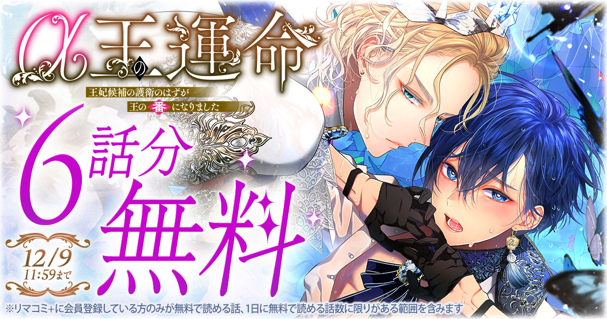 『α王の運命〜王妃候補の護衛のはずが王の番になりました〜』 (漫画:上原有紗 、原作:カヅキハルカ)が 6話分無料で読める キャンペーンを、集英社の少女・女性向けマンガ作品を集めた総合配信サイト「リマコミ+」にて開催中です。