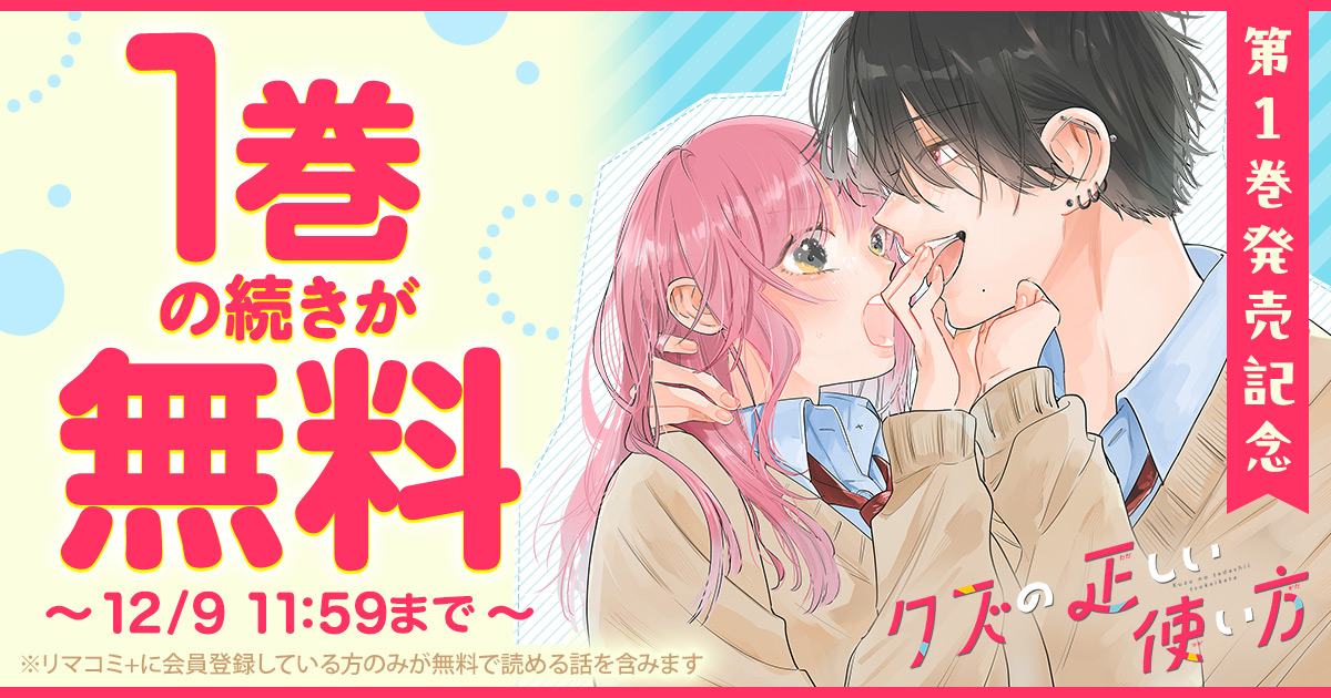 『クズの正しい使い方』 (雨野もち)第1巻が本日11/25に発売したことを記念して、 1巻の続きが無料で読める キャンペーンを、集英社の少女・女性向けマンガ作品を集めた総合配信サイト「リマコミ+」にて開催中です。