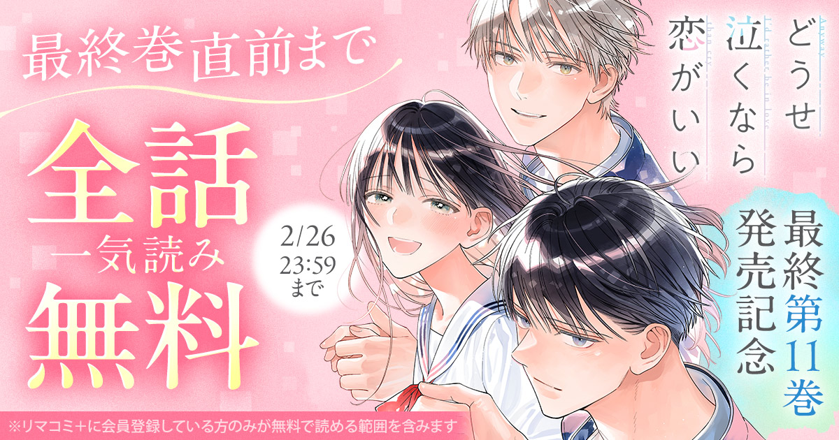『どうせ泣くなら恋がいい』 (日下あき)最終第11巻が本日2/25(水)に発売したことを記念して、 全話無料で読める キャンペーンを、集英社の少女・女性向けマンガ作品を集めた総合配信サイト「リマコミ+」にて開催中です。