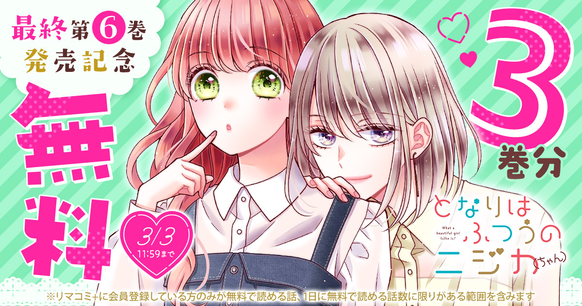 『となりはふつうのニジカ(ちゃん)』 (柚原瑞香)最終第6巻が本日2/25に発売したことを記念して、 3巻分を無料で読める キャンペーンを、集英社の少女・女性向けマンガ作品を集めた総合配信サイト「リマコミ+」にて開催中です。