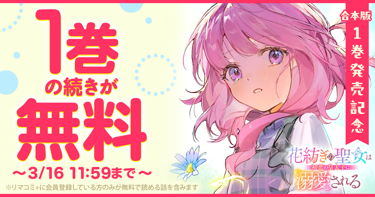 『花紡ぎの聖女は初恋の皇太子に溺愛される』 (漫画:塩谷びび、ネーム構成:灰音アサナ、原作:青季ふゆ)合本版1巻が3/1に発売したことを記念して、 1巻の続きが無料で読める キャンペーンを、集英社の少女・女性向けマンガ作品を集めた総合配信サイト「リマコミ+」にて開催中です。