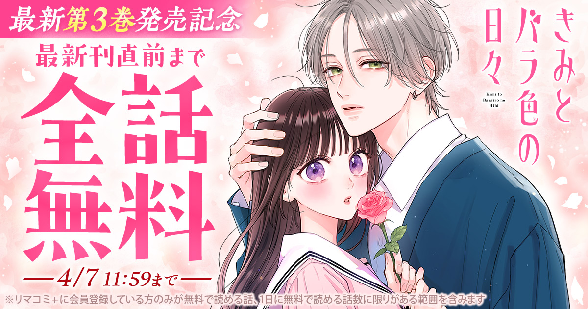 『きみとバラ色の日々』 (ひろちひろ)最新第3巻が本日3/24(火)に発売したことを記念して、 最新刊直前まで全話無料で読める キャンペーンを、集英社の少女・女性向けマンガ作品を集めた総合配信サイト「リマコミ+」にて開催中です。