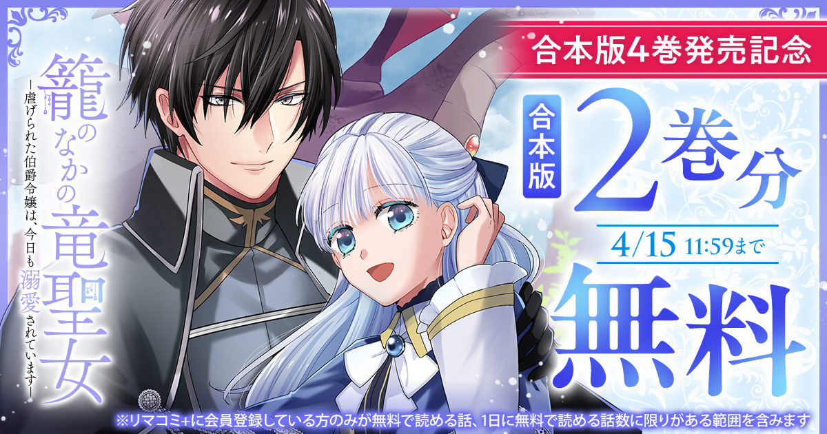 『籠のなかの竜聖女 ―虐げられた伯爵令嬢は、今日も溺愛されています―』 (漫画:氷室亮 、原作:屋月トム伽 )合本版第4巻が本日4/1(水)に発売したことを記念して、 合本版2巻分無料で読める キャンペーンを、集英社の少女・女性向けマンガ作品を集めた総合配信サイト「リマコミ+」にて開催中です。